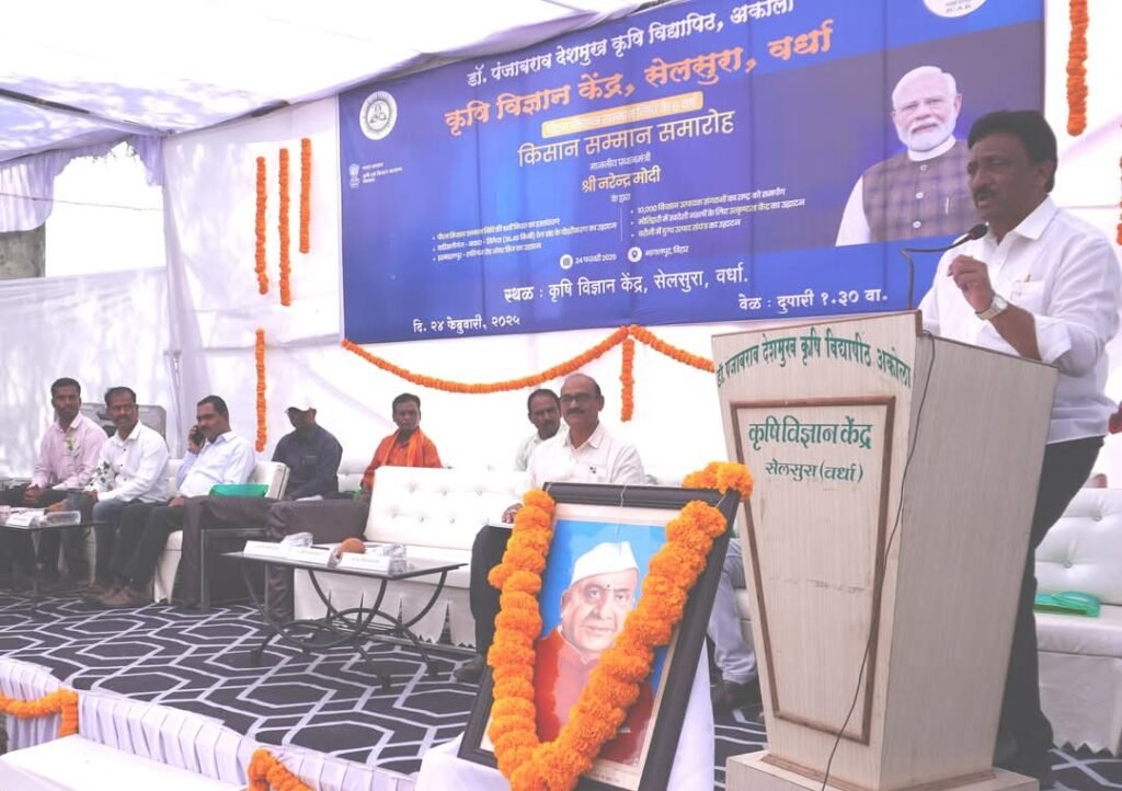 पंतप्रधान नरेंद्र मोदी यांच्या हस्ते किसान सन्मान निधीच्या हप्त्याचे वितरण करण्यात आले. या कार्यक्रमाचे थेट प्रक्षेपण डॉ. पंजाबराव देशमुख कृषि विद्यापिठ अकोला अंतर्गत कृषि विज्ञान केंद्र सेलसुरा येथे करण्यात आले होते. तसेच जिल्ह्यातील लाभार्थ्यांना पी.एम. किंसान सन्मान निधीच्या 19 व्या हप्त्याचे वितरण कार्यक्रमाचे आयोजन करण्यात आले होते यावेळी ते बोलत होते. कार्यक्रमाला आ. राजेश बकाने, वरीष्ठ शास्त्रज्ञ व प्रमुख जीवन कतोरे, डॉ. रुपेश झाडोदे, डॉ. निलेश वझिरे, डॉ. सचिन मुळे, डॉ. सविता पवार, मंडळ कृषि अधिकारी सुभाष मुडे, तालुका कृषि अधिकारी निलेश उगवेकर, निकेश इंगोले, महाबीजचे जिल्हा व्यवस्थापक श्री जांगळेकर, बायफ चे संजय बाभूळकर आदी उपस्थित होते.